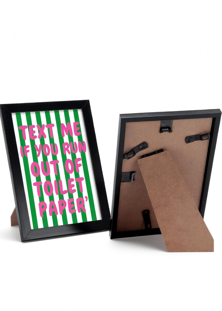 Relive the 90s with this iconic and hilarious wall art print! Featuring the classic message – "Text Me If You Run Out of Toilet Paper" – in a bold, retro style, this print is guaranteed to bring a smile to anyone’s face. Perfect for adding a touch of humor and nostalgia to any room – ideal for fans of 90s decor, quirky wall art, and a good laugh. This print is a conversation starter and a reminder to always have an emergency supply on hand!
