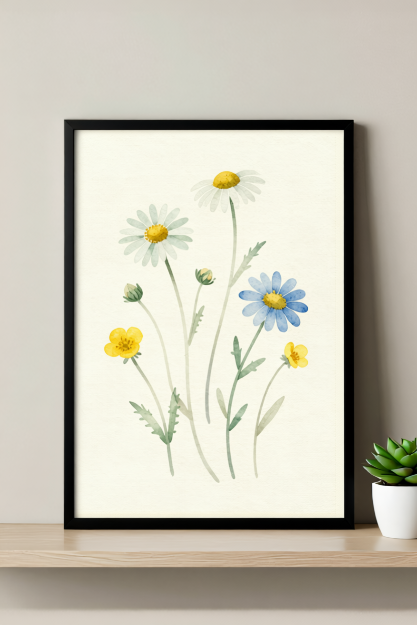 Bring a touch of delicate beauty into your space with this captivating ‘Meadow Bloom’ print. A charming cluster of daisies in white, yellow, and blue, rendered in soft watercolor tones, evokes a feeling of tranquil meadows and sunny days. The loose, expressive brushstrokes create a wonderfully natural and relaxed feel – perfect for adding a touch of serenity to your living room, bedroom, or office. It’s a reminder to appreciate the simple beauty of nature and find joy in the small things.