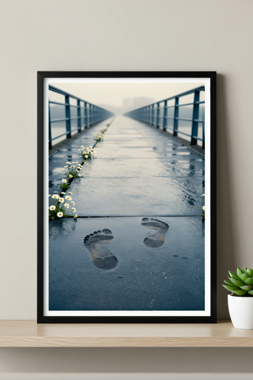 Step into a moment of peaceful contemplation with this captivating ‘Wet Footprints’ print. Two distinct footprints, glistening with rain, stretch across a grey, wet walkway – a pathway leading into the mist. The surrounding image is blurred, creating a sense of depth and inviting you to imagine where the path leads. This print evokes a feeling of solitude, introspection, and the quiet beauty of a rainy day. Perfect for adding a touch of understated elegance and a calming element to your living room, bedroom, or office – a reminder to embrace the present moment and find beauty in simplicity.