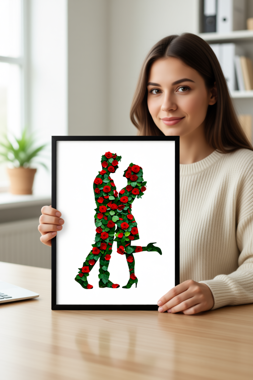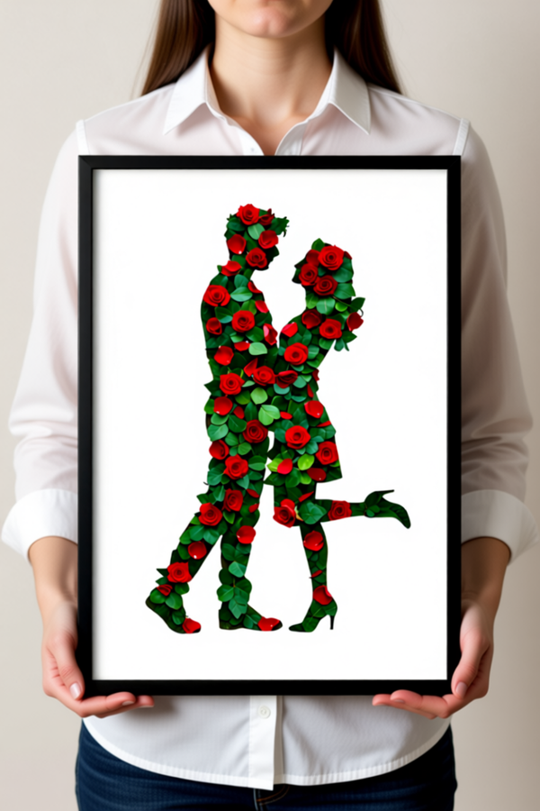This is the official “Tango in Roses” art print, capturing a romantic couple frozen mid-dance, their bodies artistically composed of vibrant red roses and lush green leaves. The dramatic dip pose conveys passion and movement, with the stark white background making the floral silhouette pop. The artwork blends natural botanical elements with human elegance, creating a striking conversation piece for any romantic setting.